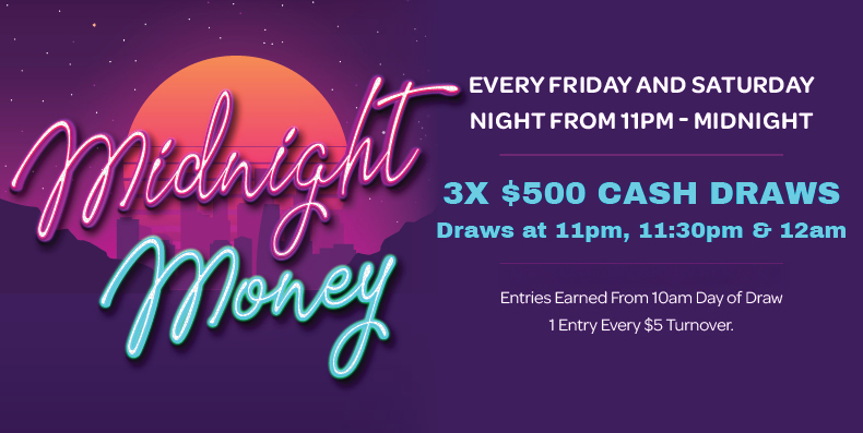 Draws take place at 11:00pm, 11:30pm, and 12:00am, with three $500 cash prizes up for grabs. 🎉